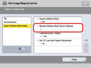 (Settings/Registration) → [Set Destination] → [Acquire Remote Address Book] → [Remote Address Book Server Address].