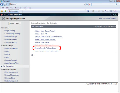 Access the Remote UI → click [Settings/Registration] → [Set Destination] → [Acquire Remote Address Book].