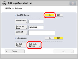 Press [SMB Auth. Settings] → set [Use SMB Authentication] to 'On'.
