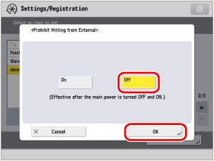 Press (Settings/Registration) → [Function Settings] → [Store/Access Files] → [Advanced Box Settings] → [Prohibit Writing from External].