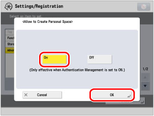 Press (Settings/Registration) → [Function Settings] → [Store/Access Files] → [Advanced Box Settings] → [Allow to Create Personal Space].