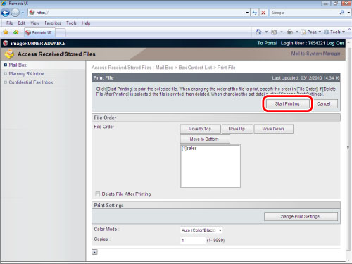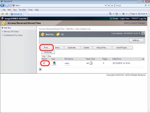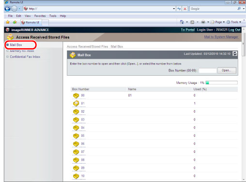 Access the Remote UI → click [Access Received/Stored Files] → [Mail Box] → click the number of the Mail Box for which to set URL Send.