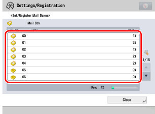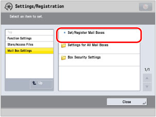 (Settings/Registration) → [Function Settings] → [Store/Access Files] → [Mail Box Settings] → [Set/Register Mail Boxes]. |