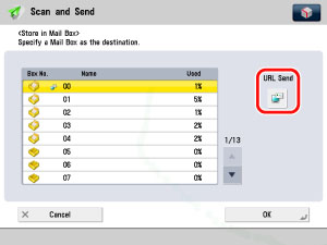 If you scan documents from the Scan and Send screen, press [URL Send] on the screen for specifying the storage location.