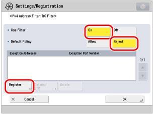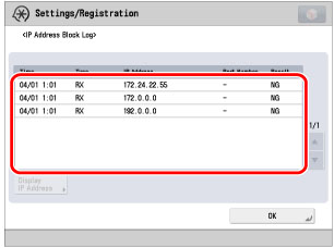 (Settings/Registration) → [Preferences] → [Network] → [Firewall Settings] → [IP Address Block Log].
