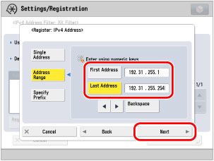 This section describes how to only allow computers with IP address from 192.31.255.1 to 192.31.255.254 to view and specify each settings on the machine using the Remote UI or application software via IPv4 network.