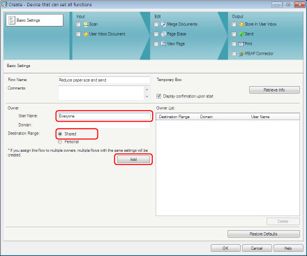 Enter 'Everyone' for [User Name] under [Owner] → select [Shared] for [Destination Range] → click [Add].
