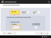 To use a separate user name and password for the Personal folder, press <Use Authentication Info. of Each User> to add a check mark. Remove the check mark to use the same user name and password entered at login. If a check mark is added to this item, a user name and password must be registered for each user.
