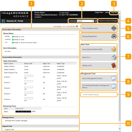 The portal page shown below is displayed when you log in to the Remote UI. This section describes the items displayed on the portal page and the basic operations.