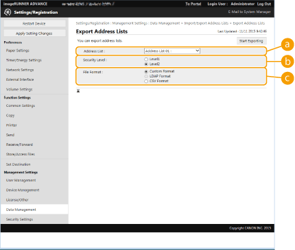 You can select particular settings to import or export, such as address lists in the Address Book, or printer settings. Administrator privileges are required in order to perform these operations.