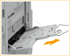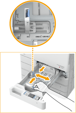 Slide the guides until they click into place. If the left guide and front guide are not aligned correctly, the paper size will not correctly appear on the touch panel display. It is also necessary to adjust the guides correctly to avoid causing a paper jam, dirty prints, or making the inside of the machine dirty.