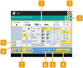 Displays the setting status such as the copy ratio, paper size, number of copies, etc. Make sure to confirm the settings here in order to copy properly. To change the settings, press the button under the display section.