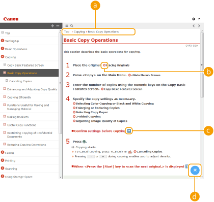 Click to specify settings such as text size, layout, and display method for the User's Guide.