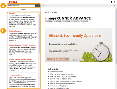 Click to display information on how to view the User's Guide, how to perform a search, and other information.